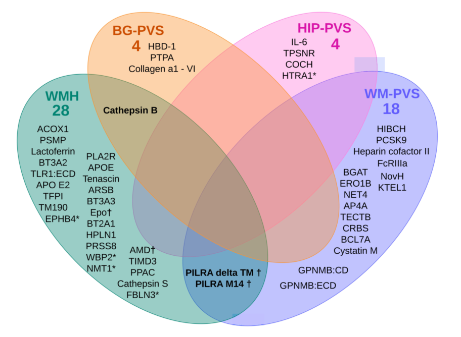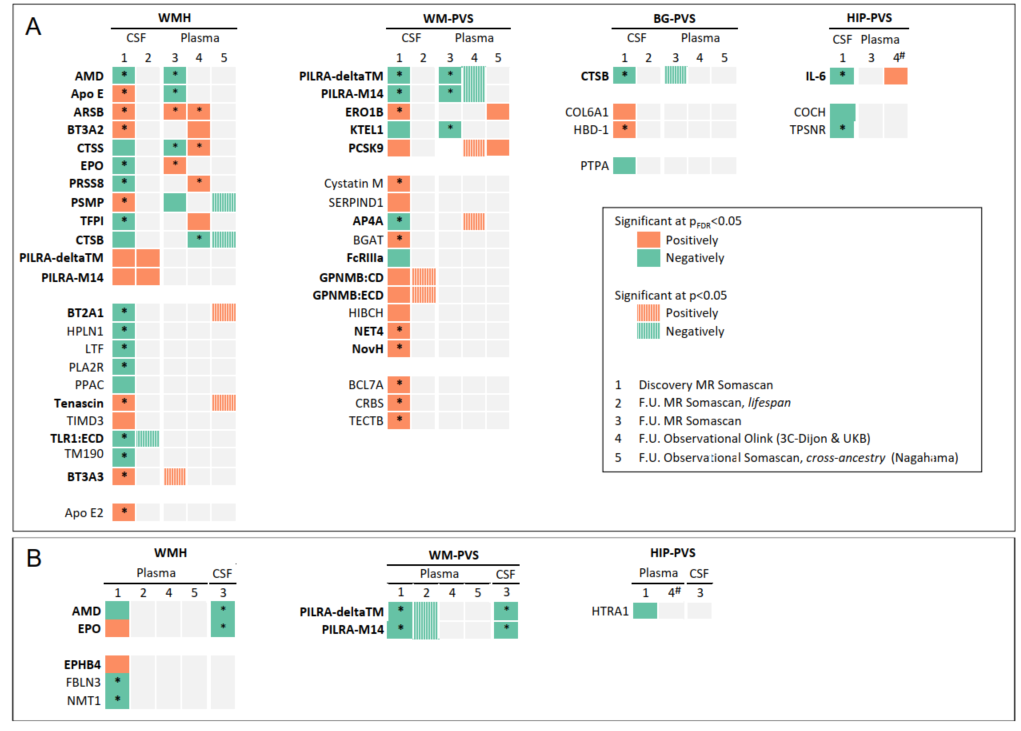 Cerebral small vessel disease (cSVD) is a leading cause of stroke and dementia with no specific treatment, of which molecular mechanisms remain poorly understood. To identify potential biomarkers and therapeutic targets, we applied Mendelian randomization to examine over 2,500 proteins measured in plasma and, uniquely, cerebrospinal fluid, in relation to magnetic resonance imaging (MRI) markers of cSVD in more than 40,000 individuals. Here we show that 49 proteins are associated with MRI markers of cSVD, most prominently in cerebrospinal fluid. We highlight associations that are consistent across platforms and ancestries, and supported by complementary observational analyses, and we explore differences between fluids. The proteins are enriched in pathways related to the extracellular matrix, immune response and microglial activity. Many also associate with stroke and dementia, and several correspond to existing drug targets. Together, these findings reveal a robust biological fingerprint of cSVD and highlight opportunities for biomarker and drug discovery and repositioning.